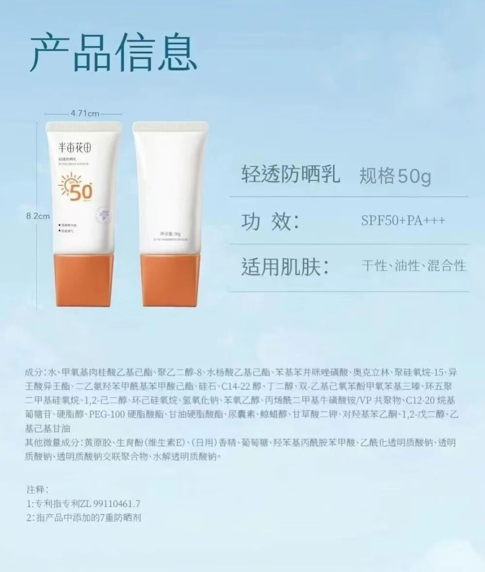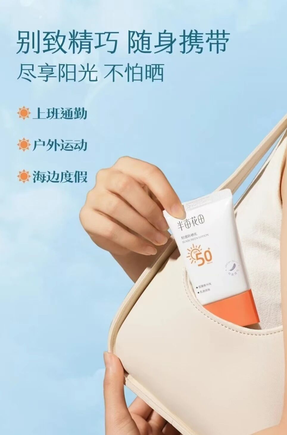 夏日的阳光热情似火,却也带着不容忽视的“杀伤力”,让防晒成为了每个人的必修课。在众多防晒产品中,半亩花田防晒乳脱颖而出,成为了众多消费者夏日防晒的心头好。_半亩花田防晒乳的包装采用简单的白色软管设计,50g的小巧规格,方便携带,无论是日常通勤、逛街,还是旅行、户外运动,都能轻松装进包包,随时随地为肌肤提供防晒保护。_打开盖子,淡淡的米白色乳液散发着清爽的花露水味,给人一种清新自然的感觉。它的质地比面霜稀一点,虽然推开时需要稍微用点力才能涂匀,但吸收速度却非常快。涂完后,皮肤表面摸起来不黏手,也没有反光的油膜感,仿佛没有涂东西一样自然。而且,它成膜速度超快,轻轻一拍,就能迅速形成一层隐形的防护膜,为肌肤阻挡紫外线的侵袭。
