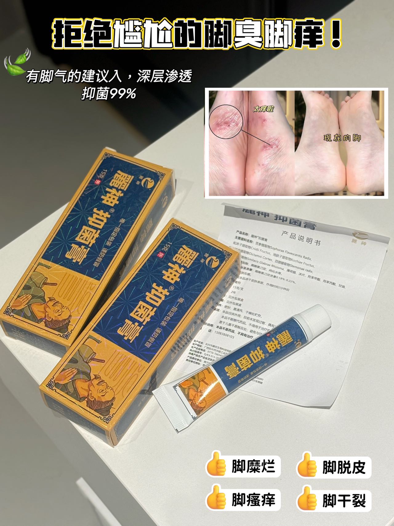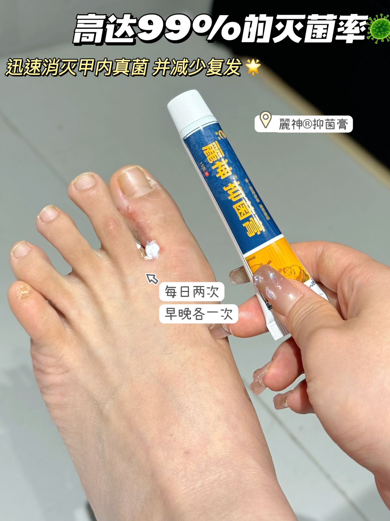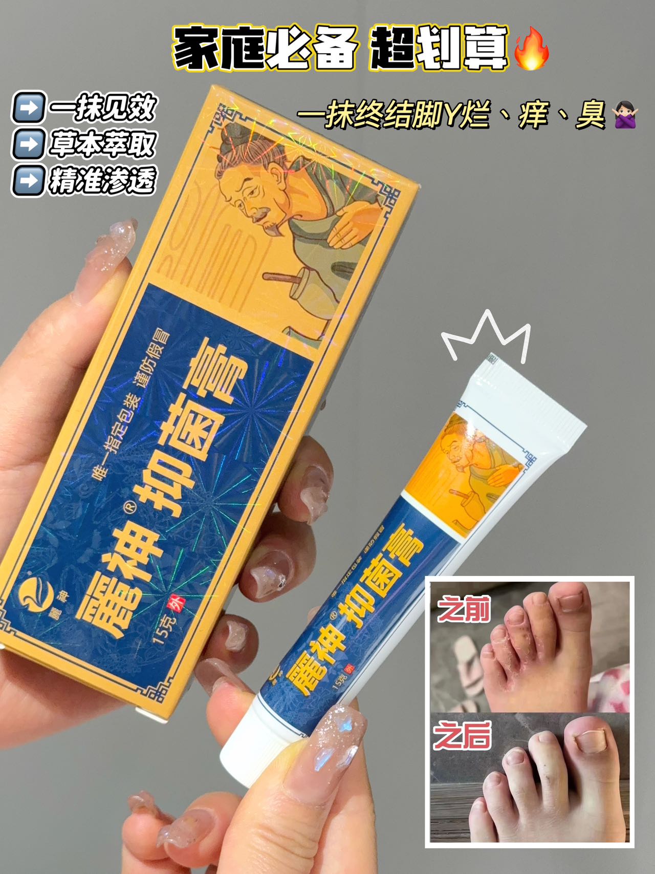 麗神®抑菌膏真的是相见恨晚!它能深层清洁脚部毛孔,消灭隐藏的真菌,从源头杜绝脚气复发。涂在脚上凉凉的,特别舒服,止痒效果超赞!现在我的脚再也不臭不痒了,太爱了!